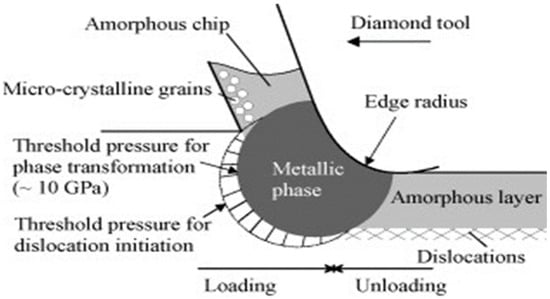 Heidari et al. [] carried out experiments and finite-element simulation to investigate the effects of tool rake angle and nose radius on the surface quality of ultraprecision diamond-turned porous silicon. Their investigation involves the use of a diamond tool with different negative rake angles. It is reported that if the nose radius of the tool is bigger, the brittle fractures are suppressed around the pore edge, and an improved surface quality can be achieved. This is premised on the choice of optimal tool geometry. The examination of the ductile-machined surfaces using Raman spectroscopy as reported by Heidari et al. [] reveals that the amorphisation of the surface layer became more important when either the tool rake angle decreases or the tool nose radius increases. As opposing what is observable with non-porous silicon cutting, the cutting pressure of porous silicon is reduced as the rake angle decreases: there is an occurrence of more brittle fractures around the pores that release pressure. Similarly, Jasinevicius et al. [] also reported the amorphisation of silicon when it was diamond-turned and examined through a transmission electron microscope (TEM). Ductile-regime machining of silicon was obtained before the fracture onset. This ductile regime was attributed to a phase transformation. The phase transformation is reported to have been evidenced indirectly by the detection of the amorphous phase in the machined surface. Jasinevicius et al. [] concluded that the mechanisms of chip formation are plastic deformation and transformation shearing and this was a result of an intermediate pressure/stress metallic phase transformation in the material. It was reported that TEM analysis of ductile chips revealed that no sign of dislocation activity or crystalline phase was observed. An investigation by Fang et al. [] affirms this claim by reporting that silicon chips have an amorphous structure when cutting is in ductile mode but have a polycrystalline structure when cutting is in brittle mode. Contrary to this observation are the reports by Goel et al. [] and Wang et al. [] that reveal that ductile chips contain a polycrystalline structure. Contrary observations by these authors were affirmed by the investigation carried out by Yan et al. [] who proposed a subsurface damage model (Figure 6) under high-pressure conditions by considering silicon’s phase transformation and dislocation behaviour. They concluded that the cutting chips are a combination of an amorphous phase and a polycrystalline phase. Nevertheless, it should be noted that this observation is for the chips. For the machined surface, for instance, with silicon and silicon carbide, the deformation of these materials and other BHMs has been attributed to (1) phase transformation as a result of the presence of high hydrostatic pressure and (2) mobility of dislocation [,,,,]. The deformation through phase transformation is the most widely reported mechanism by much of the literature [,,,,]. Some investigations by some researchers reveal that, in addition to phase transformation, dislocation mobility contributes to the material removal mechanism of BHMs [,,,]. The majority of researchers attribute the material removal mechanism of BHMs at the nanoscale to the extrusion process. However, Wang et al. [] numerically associate the material removal mechanism of silicon with extrusion and shear. It is claimed that the chip structure observed by the silicon is because of the cooperation of extrusion with shearing that led to final material removal. The author emphasized that the shear process is depressed when the ratio of the tool edge radius to the undeformed chip thickness is high.