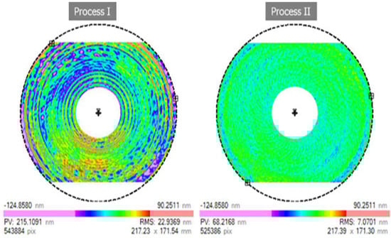 Interferometer measurements of surface form error after fine correction. Process I: grinding, polishing and smoothing, and fine correction; process II: grinding, ultraprecision grinding (UPG), polishing, and fine correction [].