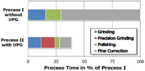 Investigation by King and Tabor [] reveals that it is possible for a brittle material (rock salt) to undergo grinding in a ductile manner. Rumpel and Enderli [] investigated and compared asphere surface productions of Zerodur® asphere in terms of process time and surface figure errors via (I) the industry-standard process chain, which involves grinding, polishing and smoothing, and fine correction; (II) the proposed production chain, which involves grinding, ultraprecision grinding (UPG), polishing, and fine correction. The authors claim that the second route of production that includes UPG before polishing can serve as a possible alternative to diamond turning where it is not a suitable machining technique such as in optical glasses. The surface form errors in terms of surface roughness of the two production routes after the final fine correction processes are shown in Figure 7. It was concluded that employing UPG achieved aspheres of superior quality with an irregularity of 68 nm and an RSM of 7 nm (Figure 7). Likewise, unlike production route (I), process times for polishing and fine correction are reasonably lower which leads to less overall production time (Figure 8). Although process II is being used in the authors’ company for volume production of lightweight aspheres, they assume lesser use of process II by many companies due to the highly demanding process control in UPG.