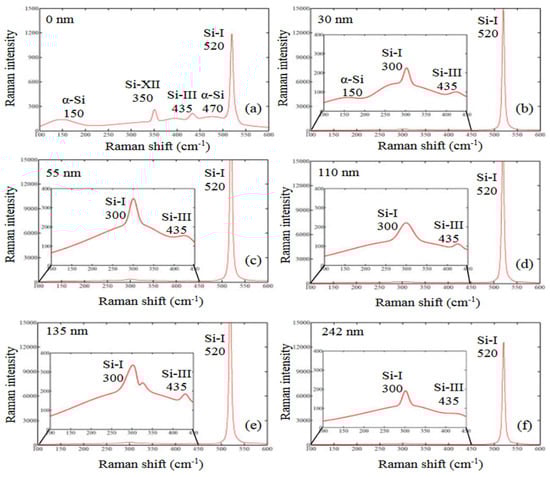 Raman spectroscopy examination of the finely ground silicon wafer at etching depths of (a) 0 nm, (b) 30 nm, (c) 55 nm, (d) 110 nm, (e) 135 nm, and (f) 242 nm [].