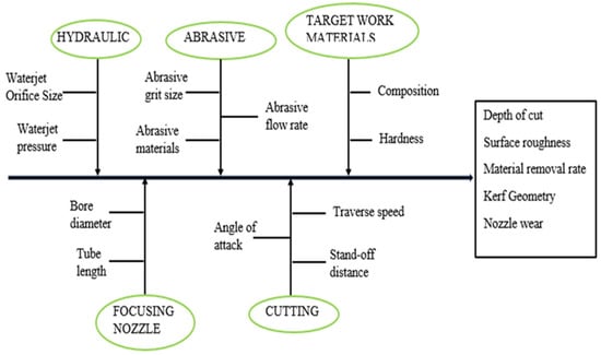 Unlike the mechanical ultraprecision machining techniques of hard and brittle materials discussed previously, abrasive waterjet precision machining (AWPM) has the following advantages: (1) materials independence; (2) structural and chemical integrity of the parent material is maintained; (3) no generation of heat-affected zones or induction of any heat damage to the parts; (4) with a single tool, multiple machining modes; cutting, milling, bevelling, and drilling among others can be carried out; (5) faster cutting; and (6) difficult and delicate materials like hardened steel, composites, alloys, laminates, and so on can be machined []. Liu [] compared abrasive waterjet (AWJ) machining with other precision machining methods considering various factors such as tool performance comparison, particle size and thickness, and types of materials among others to list these advantages of AWJ. Despite these advantages, AWJ has its limitations when machining composites; the two partner materials may be weakened by abrasive garnet or bonding between the fibres and matrix may be affected. This could lead to a reduction in the mechanical properties or a reworking time increase [].