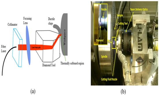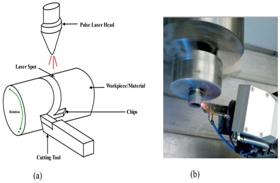 There are hybrid machining techniques that are employed using conventional machining processes such as turning, milling, grinding, and drilling and various sources of heat to preheat BHMs or during machining of BHMs at the macro-/microscale level. Such processes include plasma-assisted machining; laser-assisted machining; induction-assisted machining; flame-assisted machining; and others. Any heat source is expected to meet requirements such as high heat energy density to ensure that the material is rapidly preheated; easy control of the heated area’s size and location; easy and safe integration to the convectional machines; and the cost should be reasonable enough to implement []. Based on these requirements, laser source has been recommended as a machining method capable of producing high-quality machined parts with cost-effectiveness [,]. Although the investment cost of laser may be high, its many applications or benefits override the cost. Among these benefits are very high power intensity, easy integration into conventional machines, the laser beam can be focused to ensure that heat concentration is high, coherence, and so on [] cited [].