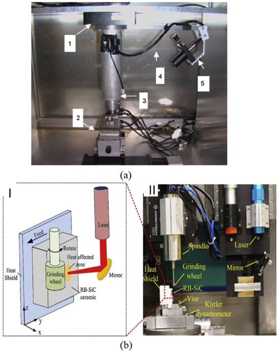 (a) Laser-assisted milling process experimental setup (1: rotary stage for orienting the laser, 2: stacked linear stages—X, Y and Z, 3: spindle assembly, 4: fibre optic cable, 5: collimator and micrometer assembly); adapted from []; (b) Laser-assisted microgrinding (I—schematic diagram; II—Experimental setup); adapted from [].