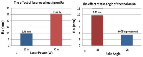Mohammadi et al. [] investigated the effects of laser power, cross-feed rate, and tool rake angle on the surface finish of silicon using the hybrid method of SPDT and µ-LAM. The conclusion from this investigation is that it is possible to use the µ-LAM technique to obtain an optical-quality surface finish because the brittleness of the material decreases with laser heating and brittle fracture is avoided in the machining region. The effect of a highly negative rake angle on the machined surface was investigated by comparing the surface roughness of the rake angles of −45° and −25°. The silicon surface roughness after machining was reduced from 9.78–3.8 nm (60% improvement) with the tool using a rake angle of −25° and laser power of 20 W (Figure 14b). In their research, emphasis is placed on the laser power selection (optimal laser power of 20 W) because higher power could cause overheating, thermal cracks, and burning which would result in a rougher surface: 9.78 nm (20 W)–25.4 nm (30 W) surface roughness (Figure 14a). Recent research by Ke et al. [] corroborates this statement. Ke et al. [] observed that at a lower cutting speed of 500 mm/min, the resultant cutting force reverses by a sudden increase when the laser power exceeds 35.5 W as compared with the cutting speed of 1000 mm/min. The authors attributed this observation to the change in cutting mechanism from shearing to extrusion because of tool edge bluntness caused by material adhesion around the tool edge which, in turn, resulted in a high surface roughness value and led to an increase in the resultant cutting force. This material adhesion was claimed to be because of excessive high local temperature that caused overheating of the material workpiece. In comparison to conventional single-point diamond cutting of silicon with one coupled with µ-LAM, the critical depth of cut (DoC) increases by 364% []. It was concluded that the detriment to the cutting process is an excessively high laser power, and to obtain a large critical depth of cut, avoid overheating, a minimised resultant cutting force, and a small surface roughness, an optimised process parameter combination must be selected. Micro-laser-assisted machining (µ-LAM) has been used to fabricate or investigate the machinability of various materials with similar reports and observations stated herein [,,].