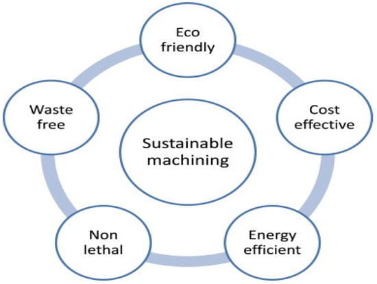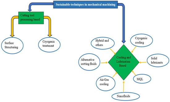 The ultraprecision or precision mechanical machining processes discussed previously as a manufacturing process have contributed to sustainable manufacturing by ensuring minimal waste generation. Sustainable machining has been viewed to be aiming at eco-friendliness, cost-effectiveness, energy efficiency, illness-free operation, and being waste-free (Figure 16). Ultraprecision or precision mechanical machining of BHMs requires cutting fluid to ensure prolonged cutting tool life (less tool wear), improved surface finish, reduced cutting temperature, reduced production costs, and more. These fluids perform these major functions in machining: lubrication, cooling, chip removal, and corrosion protection [,]. However, cutting fluid has its disadvantages: negative impacts on the environment and human health, and high cost of storing and disposal []. Answering the call for sustainability in machining processes, the researchers in this discipline have performed a series of investigations that include dry cutting, reduction in power consumption, alternative cooling/lubrication techniques to conventional cooling/lubrication techniques (mist cooling, flood cooling, and high-pressure cooling), hybrid cooling/lubrication techniques, replacement of mineral oils/petroleum-based oils with nontoxic and biodegradable oils (vegetable oils), and others (Figure 17) [,,,]. Each of these sustainable machining techniques (Figure 17) has its pros and cons, and these are stated by Chetan et al. [].