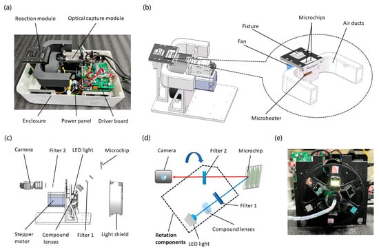 The photos and design scheme of the microdevice. (a) Internal structure image of the prototype with a bottom case (acrylonitrile-butadiene-styrene (ABS)). (b) The schematic of the reaction module. (c) The schematic of the optical capture module. (d) The principle of the fluorescence collection. (e) The photo of the rotation components.