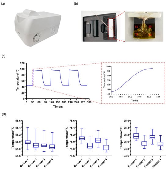 (a) Appearance of the microdevice (380 mm × 245 mm × 245 mm). (b) The detector is inserted into the reaction module for temperature recording (top view of the microdevice and the distribution of four temperature sensors. (c) Temperature curve of the microheater (thermal cycles from 45 °C to 95 °C). (d) Temperature uniformity of the microheater at 55 °C, 75 °C, and 95 °C.