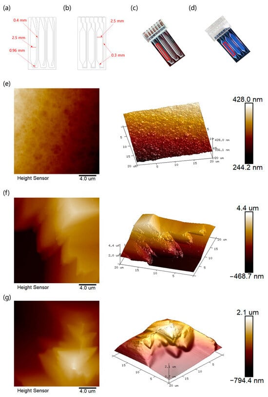 Design schematic of the (a) sandblasted and (b) DRIE microchannels. Photos of (c) sandblasted and (d) DRIE microchips (AFM analyzed the marked areas of microwells). The 20 μm × 20 μm AFM surface morphology of silicon substrate processed by (e) DRIE, (f) sandblasting without BSA coating, and (g) sandblasting with BSA coating (60 min dipping time at 37 °C).