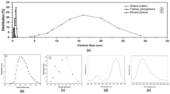 The measurement of single/mixed powder distribution, absorption spectrum, and luminescence excitation spectrum with powder (MALVERN Mastersizer 2000). ■ is the yellow phosphors powder, and the average size is 13.5 um in the figure (a); ● is the glass matrix powder, and the average size is 0.7 um in the figure (b); ▲ is the mixed powder mixer for 4 h at 450 rpm, and the average size is 0.34 um in the figure (c). The absorption spectrum and luminescence excitation spectrum were measured using PL in 450 nm and 540 nm in figure (d) and (e), respectively.