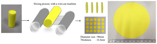 The compositions of the glass matrix were 10 mol% B2O3, 10 mol% Sb2O3, 70 mol% SiO2, and 10 mol%Ta2O5. The mixed raw materials were melted at 557 °C. After cooling, we ground the glass matrix of the B2O3-Sb2O3-SiO2-Ta2O5 (D263, Schott AG, Jena, Germany) into ceramic powders with a size of about 10 μm. Next, we uniformly spread the yellow phosphors (Y3Al5O12:Ce3+, NYAG4454, Intematrix Corp., Fremont, CA, USA) with a size of about 15 μm into the glass matrix powder with a weight ratio of 84 wt%. The absorption and luminescence excitation spectra were at 450 nm and 540 nm. The average powder size distribution was 0.34 um, as shown in Figure 1. The material was mixed with a tubular vibration mixer for 4 h at 450 rpm. We then pressed the mixture powder to form a PiG precursor. Then, a 4 inch PiG powder block was produced and sintered at 680 °C for 30 min and annealed at 350 °C for 120 min below the glass transition temperature in a ceramic die-casting furnace. In the cutting and grinding process depicted in Figure 2, we controlled the thickness and diameter of the PiG wafer, maintaining them at 0.3 mm and 90 mm, respectively.