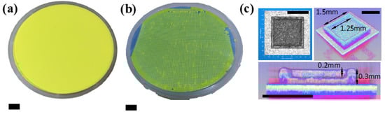 (a) PiG wafer (scale bar, 10 mm), (b) FS-PiG wafer (scale bar, 10 mm), (c) FS-PiG structure (scale bar, 1 mm).