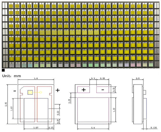 White light-emitting diodes (LEDs) are essential because they can replace traditional light sources, such as incandescent and fluorescent lamps, due to their high luminous efficiency, long lifetime, and environmental friendliness [1,2]. One major challenge in white LED technology is achieving high color uniformity and better reliability, which is critical for high-power lighting applications. There are some essential approaches for attaining high color uniformity in white LEDs. One uses the scattering effect to deflect the light direction to balance blue and yellow light distributions by introducing micro- and nano-particles/structures and optimizing the phosphor particle size [3,4,5,6]. The other uses the Beer–Lambert law to adjust the amount of blue light at specific angles by optimizing the thickness distribution, location, and material of phosphor-converted layers [7,8,9,10]. However, there are still limited technologies for achieving high color uniformity (CCT and CIE) and good reliability in large-scale white LEDs. Therefore, developing a suitable large-scale white LED package is essential to achieve high color uniformity with excellent reliability.