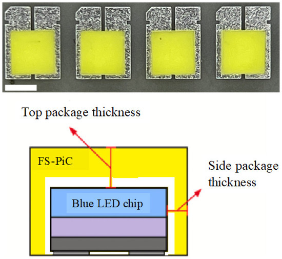 Regarding packaging structure, it is directly attached to the chip surface and can achieve high color uniformity through its sufficient scattering ability and uniform thickness distribution. The manufacturing methods used were pulse jetting [15], dispensing [16], compression molding [8], or 3D printing [17], to control the top thickness of the encapsulant, forming chip-scale packaging (CSP) structures. These CSP structures have the potential to achieve both a small size and a high luminous density.