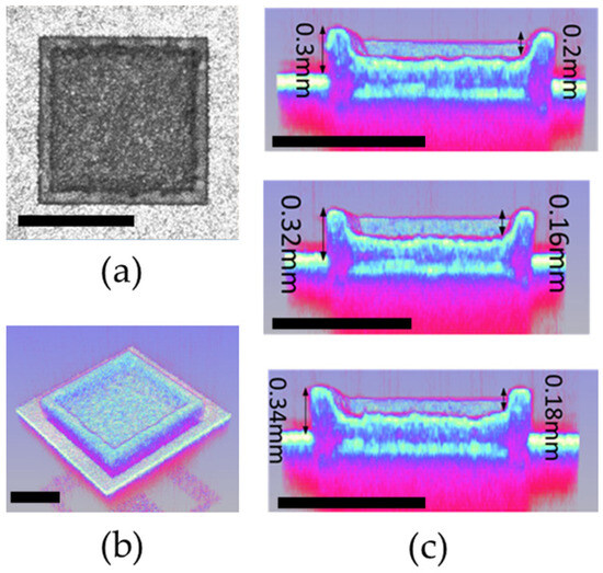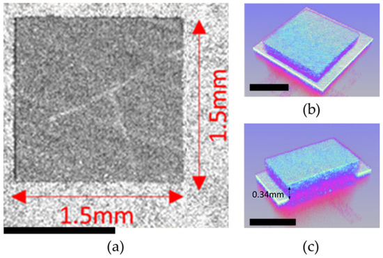 Optical image analysis of FS-PiG (scale bar, 1 mm): (a) top view in the 2D image, (b) tilt angle in the 3D image, and (c) sectional view in the 3D image.