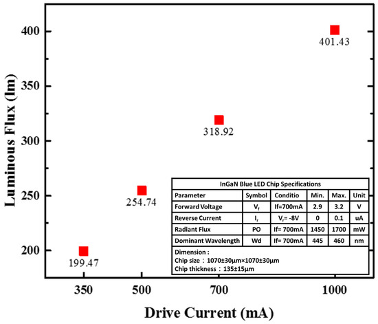 The color temperature and chromaticity coordinates of the FS-PiG-based white CSP-LEDs were measured using a spectroradiometer (CAS 140CT, Instrument Systems, Munich, Germany) equipped with an integrating sphere (IS-1.5-SA, Instrument Systems, Munich, Germany) at different driving currents. The color temperature of the LEDs increases from 5638 K to 5935 K as the driving current increases from 350 mA to 1000 mA. The chromaticity coordinates of the LEDs at different driving currents are shown in Figure 9. Observers can note that the chromaticity coordinates remain almost constant at (0.35, 0.39) within the entire current range, indicating the excellent color stability of the FS-PiG-based white CSP-LEDs. We calculated the conversion efficiency of the phosphor in the CSP-LED, as it is necessary to determine the input power of the LED. The constant forward voltage was 3.2V for the CSP-LED, and the conversion efficiency can be measured using luminous efficiency. This estimation assumes that the light source’s internal quantum efficiency (IQE) is close to 100% and that the phosphor maintains a constant spectral power distribution (SPD) at all current levels. In this study, we approximate the conversion efficiency as the ratio of the luminous flux emitted by the LED with the micro-square via structure to the luminous flux emitted by the LED without the micro-square via structure, both operating at the same current level. Assuming that the LED without the micro-square via structure has a luminous efficacy of 200 lm/W, the conversion efficiency can be calculated at different current levels as follows: