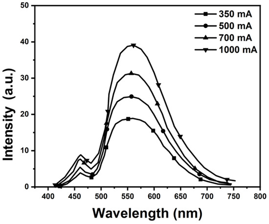 For the electroluminescence spectra experiment, we used a spectroradiometer to measure the radiation intensity of CSP-LEDs with different wavelengths and currents. To investigate the photoluminescence (PL) spectra of the fabricated FS-PiG-based white CSP-LEDs, we used a spectrometer (QE65000, Ocean Optics, Orlando, FL, USA) to measure the EL spectra. We measured the PL spectra at different driving currents, ranging from 50 mA to 1 A. Figure 10 presents the PL spectra of the FS-PiG-based white and conventional LEDs at a driving current of 1 A. The PL spectra of the FS-PiG-based white LEDs are broader than those of the traditional LEDs, indicating that the FS-PiG layer can effectively broaden the PL spectrum. Using a micro-square, the PL spectrum can be measured using a spectrometer to analyze the emitted light from an LED. We can adjust the current to drive the WLED lamp from 350 mA to 1000 mA. By examining the PL spectrum, we could identify the peak emission wavelength (PWL) of the phosphor used in the LED with a micro-square via.