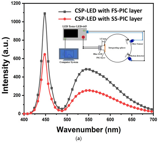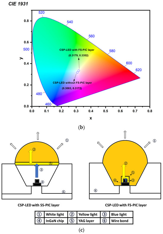 (a) The spectral luminous efficiency, (b) CIE chromaticity coordinates of the CSP-LED without/with FS-PiG layer. As illustrated in (a), the measurement setup employs the LED Tester LED-645 from the ISM-360 series by ISUZU OPTICS to supply the driving current to the blue LED. A 450 nm GaN-based blue LED serves as the excitation light source. The experimental configuration includes an integrating sphere testing system with optical fibers and a spectrometer to record the spectral data. This system is used to evaluate the photoluminescence spectrum, CIE 1931 (x, y) chromaticity coordinates, correlated color temperature (CCT), color rendering index (CRI), and photoluminescence efficiency of the Phosphor-in-Glass (PiG) samples. and (c) the structure of CSP-LED with SS-PIC layer and FS-PIC layer, respectively.