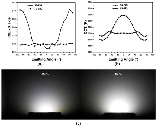 Figure 12 shows the advantages of the emitting light type in the different emitting angles, which compares color coordinate distribution, CCT, and luminous performance. Figure 12a shows the X-axis profile analysis of EIC in the SS-PiG and FS-PiG. The center points of SS-PiG and FS-PiG were similar and close at 0.31 and 0.32, but the standard deviation gap was 23 times greater when the values were 0.07 and 0.003, respectively.