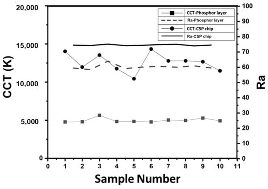 The CCT and Ra of spectral power distribution in every 10 samples, which samples were a flat fluorescent sheet on a blue chip and a fluorescent sheet with saddle structure on a blue light chip.