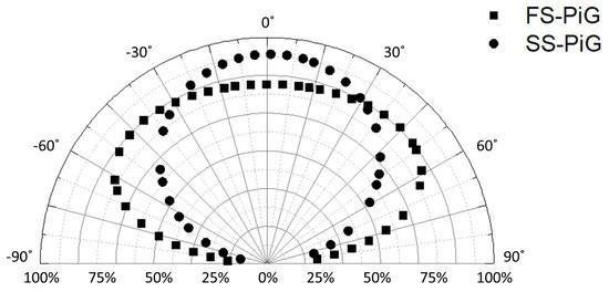 The light distribution curves of FS−PiG and SS−PiG, encapsulated respectively with blue LEDs, were measured and analyzed using a goniophotometer.