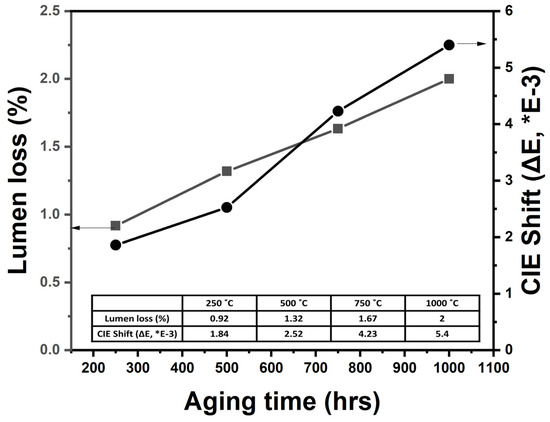 To evaluate the thermal stability of the fabricated FS-PiG-based white CSP-LEDs, we conducted accelerated aging tests at a temperature of 350 °C for 1008 h. We evaluated the thermal stability by measuring the optical output power and color coordinates before and after the accelerated aging tests. We observed that the measured optical output power and color coordinates of the FS-PiG-based white LEDs and conventional LEDs before and after accelerated aging tests did not change the content. The FS-PiG-based white LEDs exhibited lumen loss of only 2% and a reduced chromaticity shift of 5.4 × 10−3—values much lower than those of conventional LEDs. The high ceramic melting temperature of up to 510 °C contributes to the good thermal stability of the FS-PiG. To evaluate the thermal performance of the FS-PiG-based white LEDs, we performed accelerated aging tests on the LEDs by placing them in an oven at 350 °C for 1008 h. This specification is based on JESD22 Method A108-C [20]. We monitored the LEDs’ lumen maintenance and chromaticity shift during aging. After 1008 h of aging at 350 °C, the lumen maintenance of FS-PiG-based white LEDs exceeds 98%, demonstrating remarkable thermal stability. The chromaticity shift during the aging process is minimal, with the LEDs’ coordinates shifting slightly from (0.32, 0.33) to (0.33, 0.34), corresponding to a chromaticity shift of 5.4 × 10−3. The high ceramic melting temperature of up to 510 °C contributes to the good thermal stability and low chromaticity shift of FS-PiG-based white LEDs, preventing the phosphor from decomposing and diffusing into the epoxy resin under high-temperature conditions. The aging test process is shown in Figure 15.