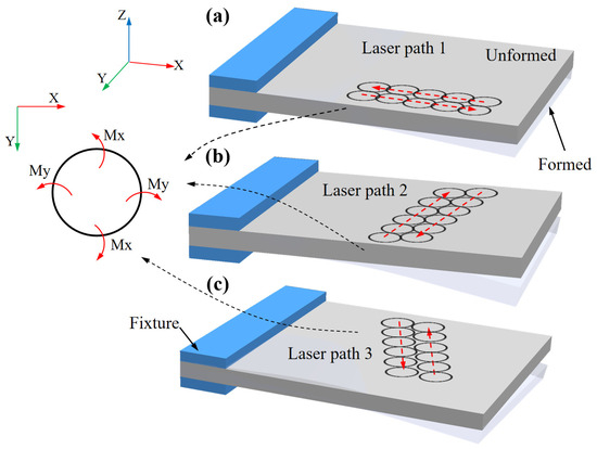 - For a 4 mm-thick aluminum alloy plate, convex deformation occurred in the direction of laser incidence, and the deformation magnitude increased with higher laser energy. Compared to the impact of laser energy on bending deformation, the impact path had a more significant effect. In the case of a 2 mm-thick aluminum alloy plate, concave bending deformation was observed relative to the laser incidence direction.