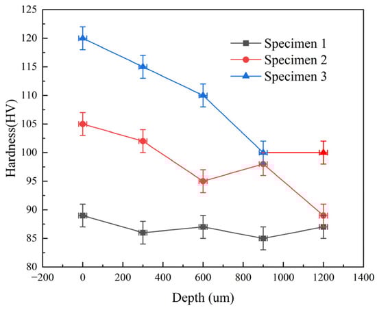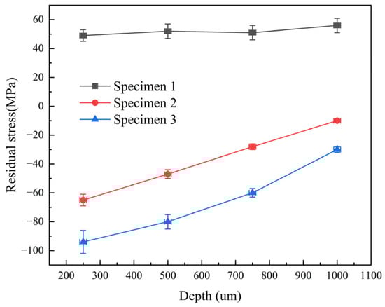 - After 0, 1, and 2 laser peenings, the surface morphology fluctuations were 22 µm, 68 µm, and 96 µm, respectively, and the roughness was 0.245 µm, 2.74 µm, and 3.86 µm. The surface hardness of the specimens was 89 HV, 105 HV, and 120 HV, with hardness decreasing along the depth direction. The residual stresses on the sample surfaces were 58 MPa, −80 MPa, and −107 MPa, indicating a change from tensile to compressive stresses, with residual compressive stresses diminishing with depth.
