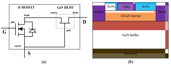 Figure 1. (a) Cascode GaN HEMT structure diagram; (b) depletion GaN HEMT structure diagram.