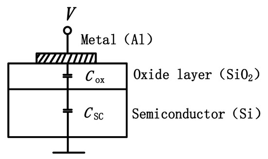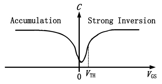 Figure 3 shows the capacitance–voltage characteristics of MOS devices. As the absolute value of negative gate voltage applied by MOS devices increases, a large number of hole charges in the substrate are attracted to the interface of the oxide layer, and the holes accumulate on the surface of the oxide layer. As the capacitance Csc of the space charge layer on the semiconductor surface increases, the MOS capacitance also increases.