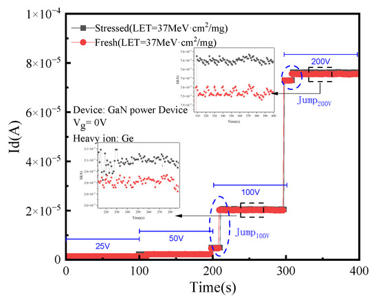 In order to explore the effect of drain electrical stress on the SEE of GaN HEMT devices, drain voltage with a size of 40 V and a duration of 2000 s was applied to the experimental devices in the off state before radiation and compared with the fresh devices. The radiation condition is Ge ions (LET = 37 MeV·cm2/mg). The bias condition and radiation injection amount are consistent during the experiment, and the radiation results are shown in Figure 4. The blue dash circles mark the current jump, and the black dash squares show the location of the partially enlarged image.
