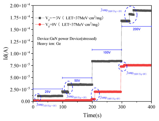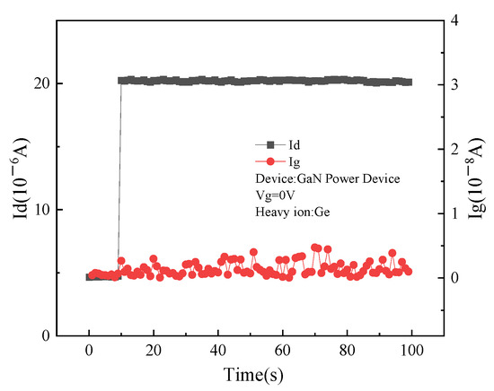 Previous studies have found that when GaN HEMT devices are in the on state, the electron–hole pairs generated by incident-heavy ions are collected through the channel. The current of the source, gate, and drain does not surge, and the electrical performance of the device is not damaged. When the device is in the off state, the 2DEG in the channel is exhausted, and the electron–hole pairs ionized by the heavy ion radiation cannot be collected through the channel. When the charge accumulates to a certain extent, a leakage path will be introduced in the GaN layer. The transient current will surge, and the device characteristics will be damaged or even burned. As a result, the device is most seriously damaged under the off-state [27]. In this research, the gate voltages are set to 0 V and −3 V, respectively, during the radiation period, and the influence of different gate voltages on the SEE is observed. Ge ions (LET = 37 MeV·cm2/mg) were used in the experiment, and the experimental results are shown in Figure 12.