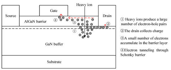As shown in Figure 6, when there is a heavy ion incident in GaN HEMT, a large number of electron–hole pairs are bound to be generated on the particle incident track. Most of the charges are collected by the drain, and a small part of the charges gather on the upper surface of the AlGaN barrier layer under the action of the device’s high gate-drain field. With the constant accumulation of electrons in the barrier layer, the width of the Schottky barrier formed by the gate electrode and the semiconductor decreases, which causes the electrons to tunnel through the gate barrier. Therefore, the current leakage path from the drain and gate of the depletion GaN HEMT to the source of the Si MOSFET is formed [25]. The red dash arrows represent the direction of charge flow.