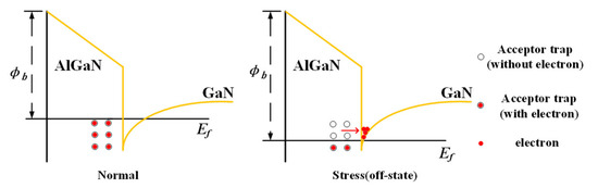 Due to the small drain stress applied in the off state in this experiment, the threshold of the converse piezoelectric effect was not reached. Combined with the experimental results, the electron re-trapping effect occurred in the experimental device, and the degradation mechanism is shown in Figure 8. The red dash arrows represent the direction in which the electrons are moving. In the AlGaN barrier layer, the acceptor trap located below the Fermi level is filled with electrons. When the off-state electrical stress is applied to the device, the energy band at AlGaN/GaN heterojunction rises, and part of the accepter trap is above the Fermi level. At this time, the electrons exit the trap and enter the channel. The acceptor trap without the electron is electrically neutral and cannot play the role of scattering center. Therefore, the 2DEG mobility increases, and the maximum transconductance of the device increases.