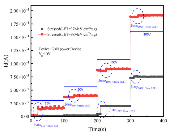 When there is a high-energy particle incident in GaN HEMT devices, they will interact with atoms inside the devices and lose some energy. This energy loss is called the linear energy transfer value (LET). After the atoms inside the device materials obtain the transferred energy, the electronic transition will occur, and electron–hole pairs will be generated on the track of the incident particles. The influence of heavy ions with different LET values on the SEE is also different. Figure 9 shows how the drain current varies with time under the radiation of Ge ions (LET = 37 MeV·cm2/mg) and Bi ions (LET = 98 MeV·cm2/mg) when the gate voltage is 0 V.