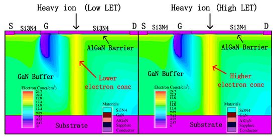 Figure 10 shows the simulation results of electron distribution inside the device when particles with different LET values incident at 1 ps. When the LET value of the incident particles increases, more electron–hole pairs will be generated in the incident track inside the device. Figure 11 simulates the peak value of a single-event transient current and the collected charge generated when ions with different LET values cause an incident in a device. With the increase in LET value, the amount of charge that can be collected by the drain increases at the same time, and the pulse current detected by the drain also increases. For a fixed GaN HEMT device, the mean ionization energy of the material is close to constant. The number of electron–hole pairs generated by a fixed LET value of heavy ions is constant. Due to the high voltage bias applied by the drain, the recombination probability of the carrier generated by radiation is small, and most of the charge is collected by the drain to form a transient current. Therefore, the peak value of the single event transient current and the collected charge of the drain show an approximate linear increase trend with the LET value.