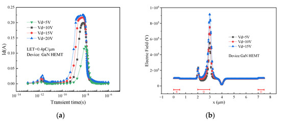 Figure 13. (a) Single event transient effects of devices with different drain voltage; (b) electric field distribution under different drain voltage.