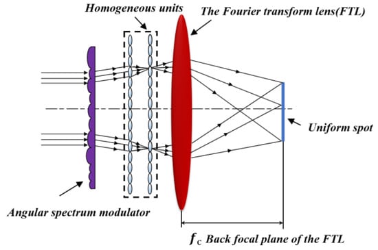 To compensate for the angular spectrum discreteness, an angular spectrum modulator needs to be introduced in the lighting system, and its optical path is shown in Figure 1. The modulator consists of multiple sub-cylindrical lens units that have varying pitches, varying sag heights, and are arranged randomly. After the beam passes through the micro-cylindrical lens arrays, the sub-beams exhibit variations in both phase and divergence angles. By controlling the divergence angle of the sub-lenses, a beam satisfying the Gaussian distribution is formed. The beam subsequently traverses the homogeneous units, which divide it into smaller sub-beams. Then, these sub-beams are overlapped in the back focal plane of the FTL by a Fourier lens and produce a uniform spot.