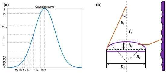 The approach for realizing Gaussian modulation is universally applicable. Different modulation angles can be achieved based on Figure 2. Figure 2a shows the curve of the Gaussian modulation function. Since both curve and micro-cylindrical lenses are axisymmetric, it is enough to illustrate only half the side along the symmetric curve. The vertical coordinate is the sampled energy distribution, and the horizontal coordinate is the corresponding angle. The finer the sampling interval of Pi, the closer the fitted curve is to the designed target. Meanwhile, an accuracy of ±0.02° can be achieved. The structural parameters of the micro-cylindrical lens determine , as presented in Figure 2b. The relationship between , pitch Di, and focal length fi is shown in Equation (1).