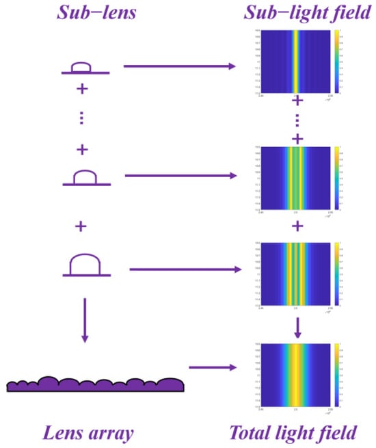 When the sub-lenses are arranged in the spatial domain, the sub-light fields generated are superimposed in the frequency domain, as shown in Figure 3. The pitch Di and focal length fi of the sub-lens will affect the generated angle of the sub-lens, thus influencing the diffracted light fields. Each sub-light field is a Gaussian distribution, superimposed on each other to form the final target Gaussian light field.