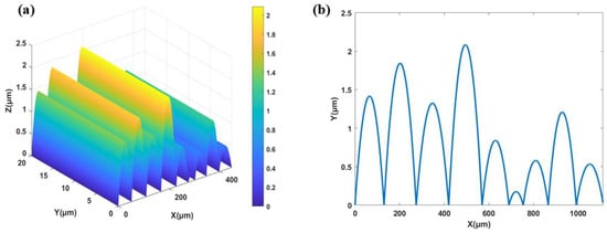 According to the design theory, the target Gaussian function curve is sampled. During the design process, Pi is sampled at 9 points, denoted as P1 to P9. Thus, the corresponding angle to can be obtained, and their corresponding energy values are listed in Table 1. Based on to , we have designed random micro-cylindrical lenses with pitches ranging from 64 μm to 149.5 μm and curvature radii ranging from 1341.1 μm to 3463.6 μm. The resulting sag heights range from 173 nm to 2083.2 nm, which is within the feasible fabrication range. Specific parameters can be found in Table 1. Then, multiple periods are used to cover the entire aperture, forming a complete structure. The structure within a single period is shown in Figure 4, where Figure 4a represents the three-dimensional morphology, and Figure 4b shows the one-dimensional profile. The length of a period is 1112.1 μm. During the design and testing, visible light with a wavelength of 532 nm is used as the light source.
