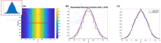 (a) Far−field scattered optical field; (b) superposition of rectangularly illuminated optical fields; (c) original curve and the fitted Gaussian distribution.