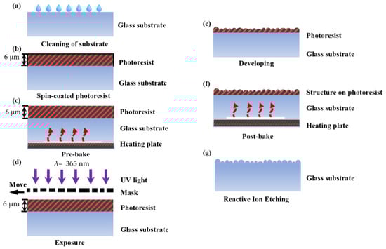 The fabrication process of random micro-cylindrical lens arrays: (a) cleaning of the substrate; (b) spin-coated photoresist; (c) pre-bake; (d) exposure; (e) developing; (f) post-bake; (g) reactive ion etching.