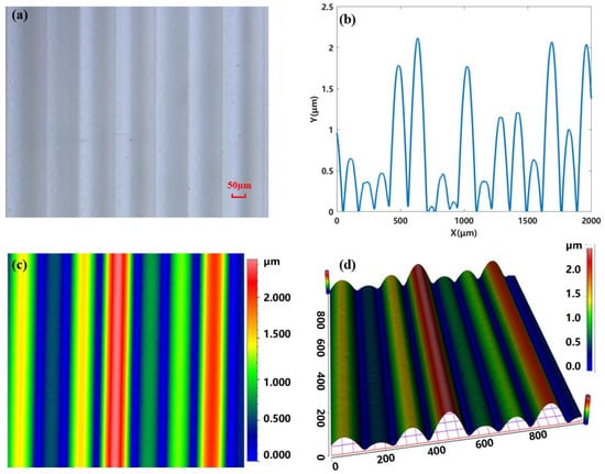 To comprehensively evaluate the performance of the structure, we use a set of precise measurement and characterization techniques. A microscope (Olympus BX51, Olympus, Tokyo, Japan) is used to obtain microscopic pictures, as shown in Figure 8a. It can be seen that the structure of random micro-cylindrical lens arrays is smooth, and all sub-lenses are rectangular in shape. As presented in Figure 8b, the pitches and sag heights of the micro-cylindrical lens are identified by a step profilometer (Stylus Profiler System, Dektak XT, Bruker, Karlsruhe, Germany). The maximum and minimum pitch are measured to be 150.1 µm and 64.1 µm, corresponding to the deepest and shallowest sag heights of 1920 nm and 101 nm, respectively. To describe the surface morphology, an optical three-dimensional (3D) surface profiler (SuperView W1, CHOTEST, Shenzhen, China) is used. The two-dimensional (2D) profile of the processed structure is shown in Figure 8c, and the 3D sketch is shown in Figure 8d. We can see that the 2D profile has continuous lines, and its three-dimensional morphology has good geometric features and smoothness. The surface roughness is also assessed by the step profilometer. During the measuring process, four areas of the substrate are chosen to quantify roughness. The measured Root Mean Square (RMS) roughness for the top, waist, bottom, and back are 1.97 nm, 9.8 nm, 6.0 nm, and 1.3 nm, respectively. This reveals that random micro-cylindrical lens arrays can be constructed by mask-moving technology with a smooth surface and great graphical fidelity.
