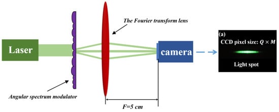 A structural model is set up to calculate the modulated optical field. Specifically, the diffracted far-field distribution is obtained by Fourier transform. The parallel beam is modulated by the angular spectrum modulator, assuming that the complex amplitude of the modulator is . Based on the scalar diffraction theory, the far-field diffraction distribution is acquired by a two-dimensional Fourier transform [32], shown in Equation (4).