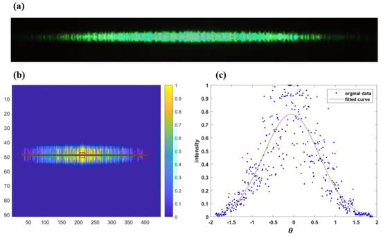 (a) light spots under 532 nm light source; (b) selection of the row of light spot centroid; (c) Gaussian fit of the centroid row.