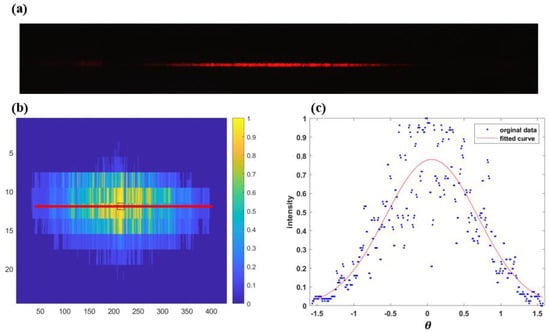 The far-field distribution of parallel light passing through the modulation device is shown in Figure 5a, which is a single-direction Gaussian light. In fact, the light field is a superposition of rectangular optical fields, as shown in Figure 5b. By normalizing the gray values of the far-field optical field, we can obtain the fitted Gaussian curve. Assuming the diffraction distance is z and the incident light spot size is S, then the sampling interval on the diffraction plane is determined by . If the pixel number of the diffracted light spot is M, the scattering angle is calculated by , which is . Then, a fitted Gaussian function can be obtained. By analyzing the function, we can calculate the corresponding modulation angle when the energy attenuates to . The final fitted angle spectrum modulation function is , , as shown in Figure 5c. Additionally, using Equation (1), the balance is 0.46%.