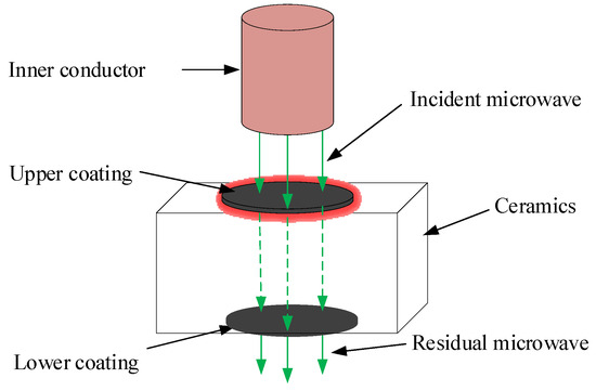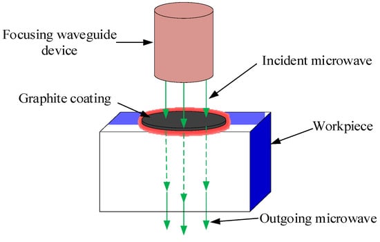 Al2O3 ceramic is opaque and does not absorb a laser, thus making it difficult to apply a volumetric heat mode. Because of its low dielectric property, it is also difficult for microwaves to interact with this ceramic. In this work, graphite with high permittivity was used to coat one surface of the Al2O3 ceramic to absorb microwaves to generate a surface heat source. Figure 1 shows the principle of producing the surface heating mode using the coating material induced by microwaves. The unabsorbed microwaves pass the ceramic body and enter the environment through the lower surface. The uneven heat distribution generated by the high electromagnetic loss on the coating material produces a thermal stress field. The cutting of the ceramic is realized by moving the thermal stress to guide crack propagation.