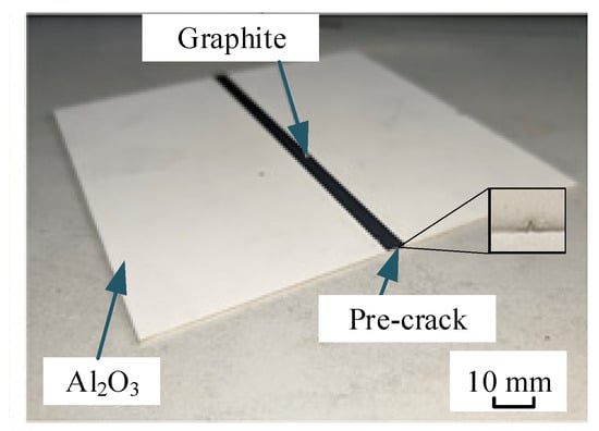 Figure 3 shows the Al2O3 ceramic plate used in this study. Graphite powder with a thickness of 0.1 mm and a width of 1 mm is coated on the expected cutting path. The plate is 100 mm × 100 mm in size. The graphite powder with a micron-size (mesh of 8000 and particle size of 1.6 μm) is mixed with alcohol. The mixture is sprayed evenly by an electric sprayer whose power comes from an air pump. As shown, a pre-crack is made on the end of the plate.