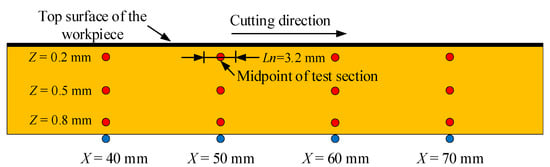 To investigate the distribution characteristics of the fracture surface quality, some measurement sites were set on the section. Figure 4 shows the location of the measurement sites in the experiments. A plane on the surface heat source in workpiece was selected as the reference. Three depth positions, which are 0.2 mm, 0.5 mm, and 0.8 mm from the reference plane in the direction of the thickness, were selected to measure the surface roughness. To achieve stable fracture quality and avoid the influence of unstable boundary conditions, four horizontal inspection positions, namely 40 mm, 50 mm, 60 mm, and 70 mm from the inlet along the cutting direction, were selected. To ensure the value of the experimental results, each experiment was repeated four times, and the average of the results was taken.