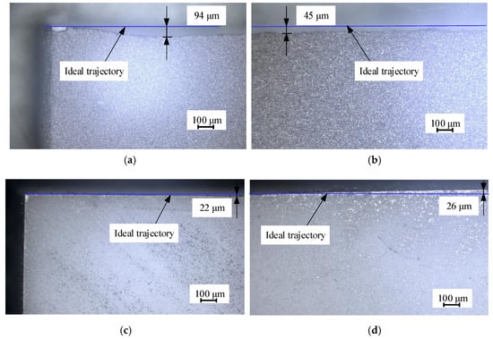 Figure 5 shows the fracture trajectories at each surface of the Al2O3 ceramic plates after cutting at a microwave power of 1000 W and a scanning speed of 3 mm/s. It can be shown that the fracture trajectory approaches a straight line when cutting ceramics with a surface heat source. Comparing the processing effect of graphite in this study and clay as the microwave-absorbing material in the literature [22], it is notable that pure graphite micron powder can achieve better processing quality.